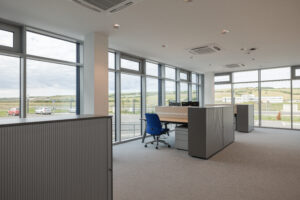 Közel 800 m2-es csarnokrész és két szinten összesen nagyjából 450 m2 irodarész készült el, amit tíz főre méretezett irodai állomással és 25 fős tárgyalóval építettek ki.